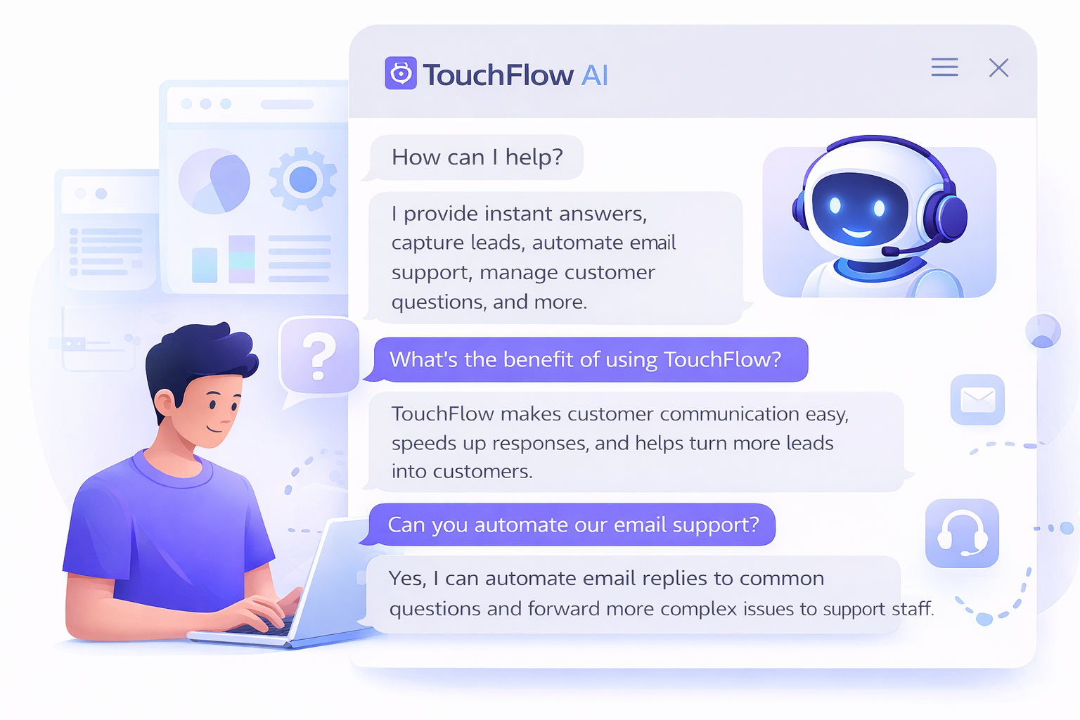 Ideal for businesses that receive regular customer enquiries. Automate responses, manage multiple conversations, and take control with advanced AI features and live agent support when needed.